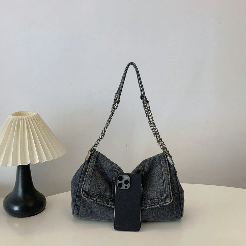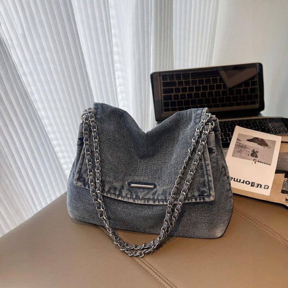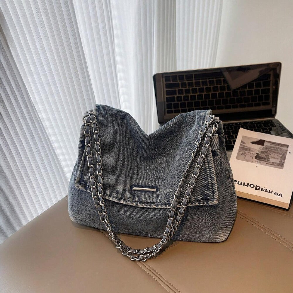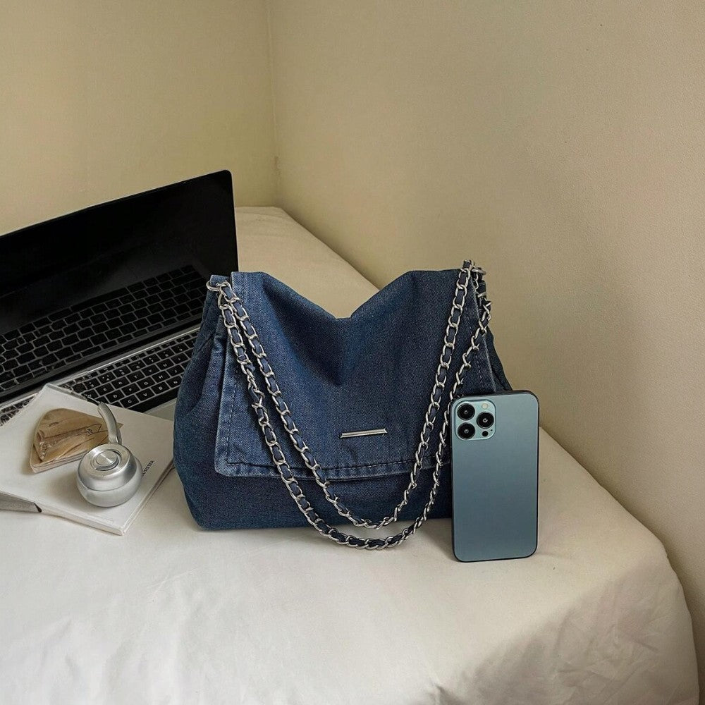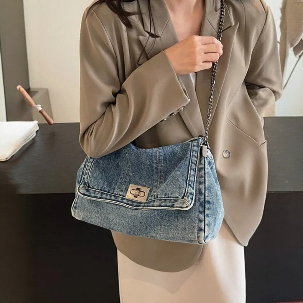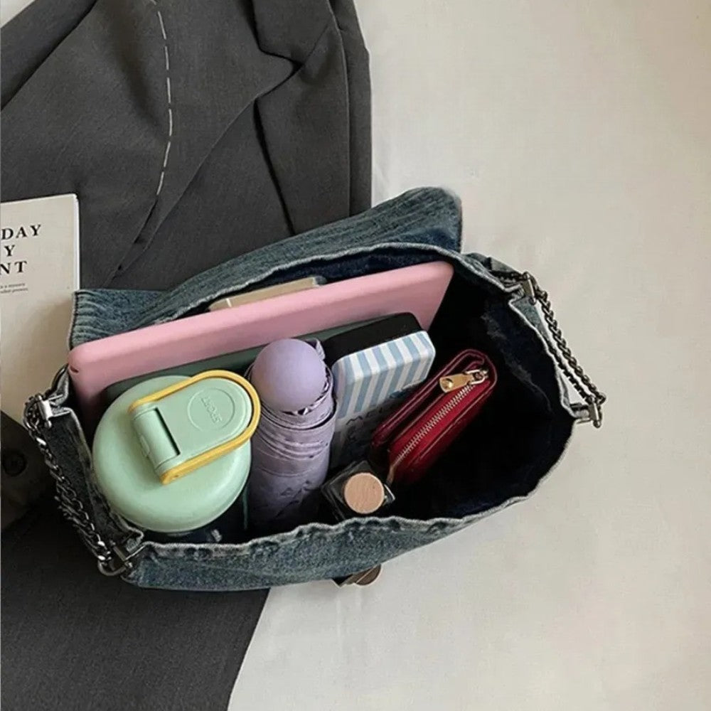 A nossa mala Grace é feita de denim de alta qualidade, combinando estilo casual com durabilidade. Projetada para ser suficientemente espaçosa, acomoda facilmente os seus essenciais: portátil, maquilhagem e acessórios do dia a dia.
